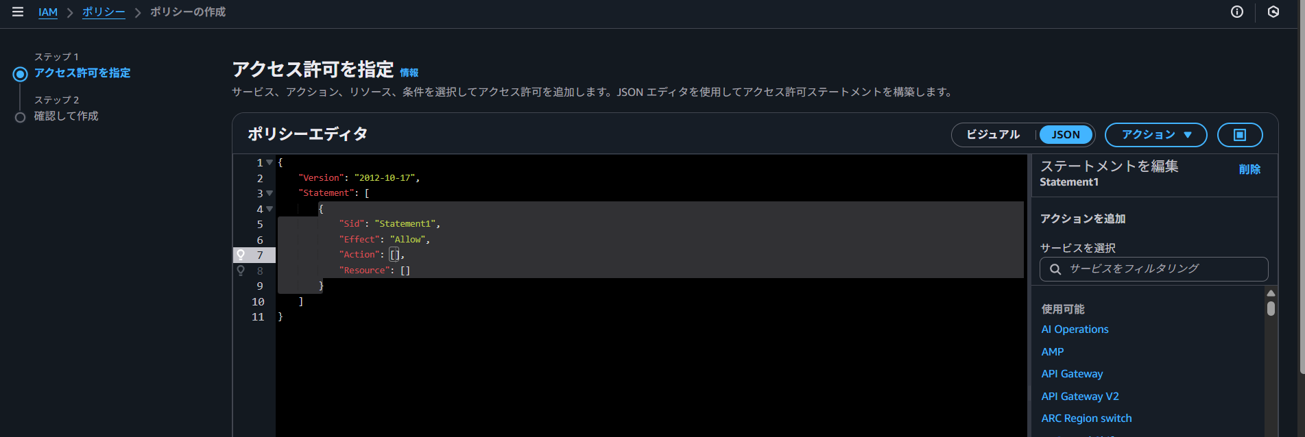 JSONでIAMポリシーを作成します。
