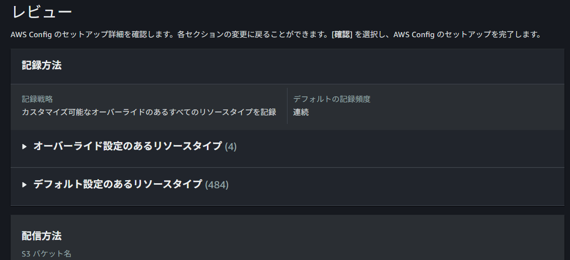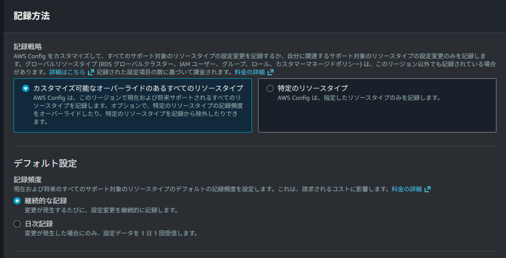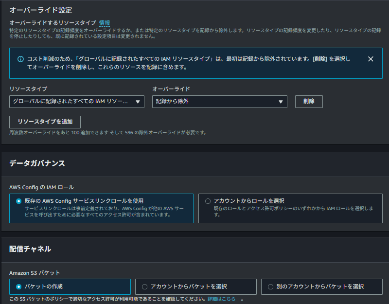 「オーバーライド設定」は、リソースタイプは「グローバルに記録されたすべてのIAMリソース」で、オーバーライドは「記録から除外」とします。いずれも初期設定ですが、コストを抑えるために IAM 関連の“グローバルリソース”が記録対象から外されます。