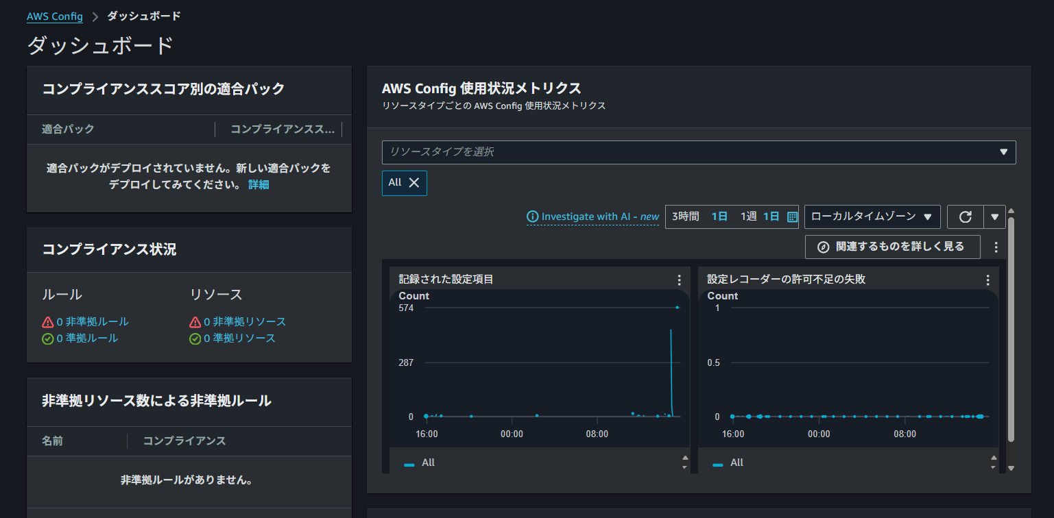 セットアップ直後は、コンプライアンス状況のルールは0ですが、AWS マネージド型ルールを有効にしたり、AWS Security Hub CSPMを有効にすると、カウントアップします。